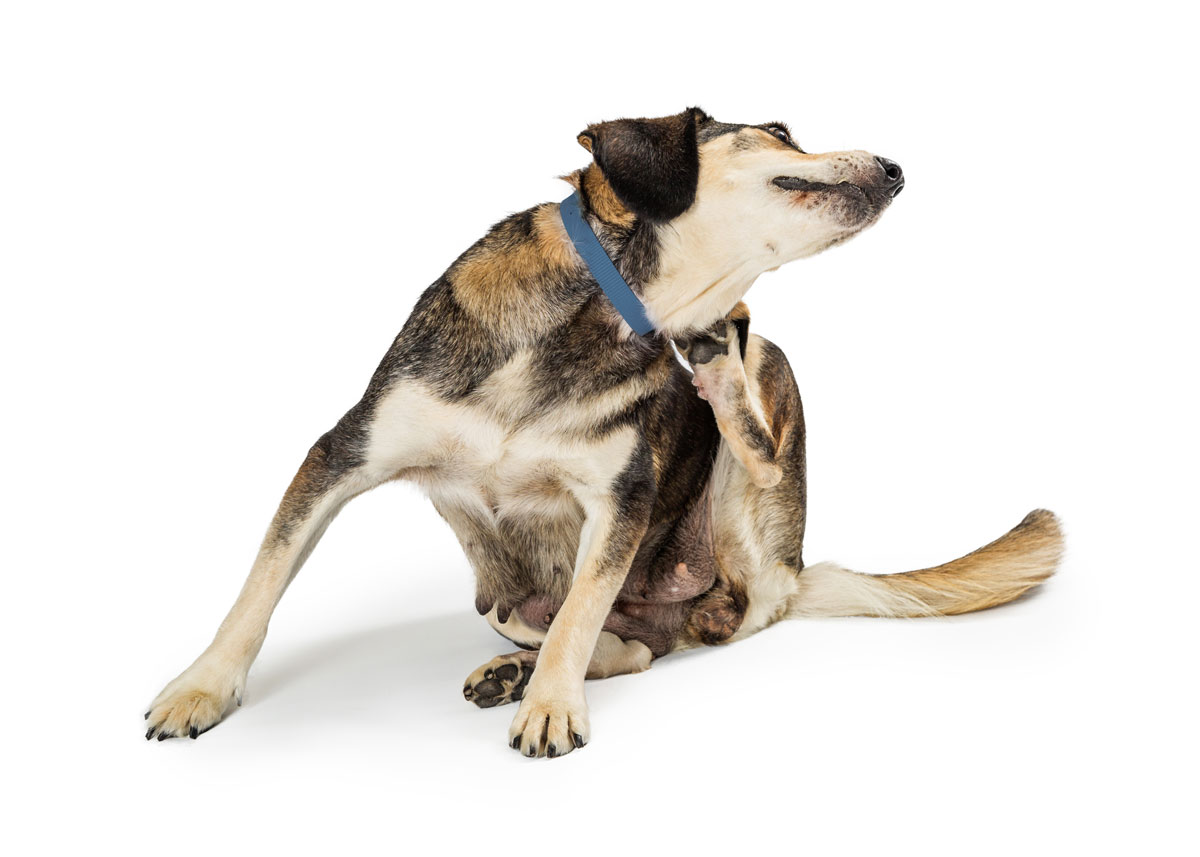Futtermittelallergien können sich in Symptomen der Haut (Juckreiz, Pusteln, Ohrenentzündung) oder des Verdauungstrakts (Erbrechen, Durchfall, Blähungen, wechselnde Kotkonsistenz) äußern.